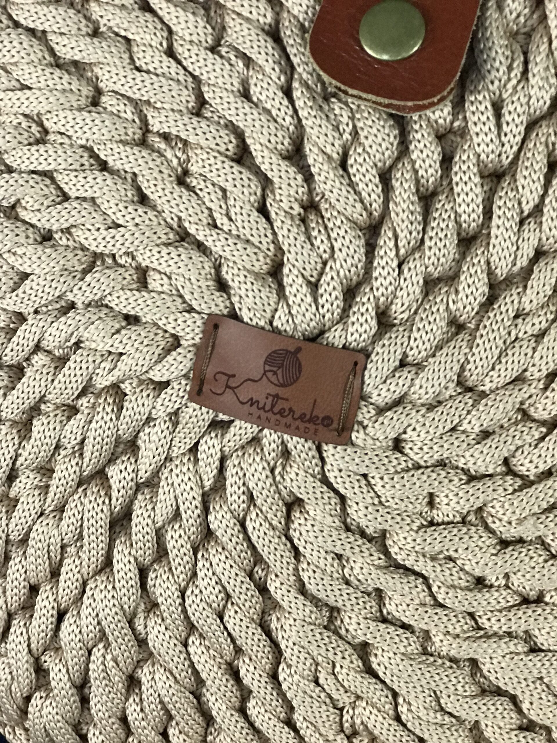 Torebka wykonana ze sznurka poliestrowego w kolorze ciasteczkowym.